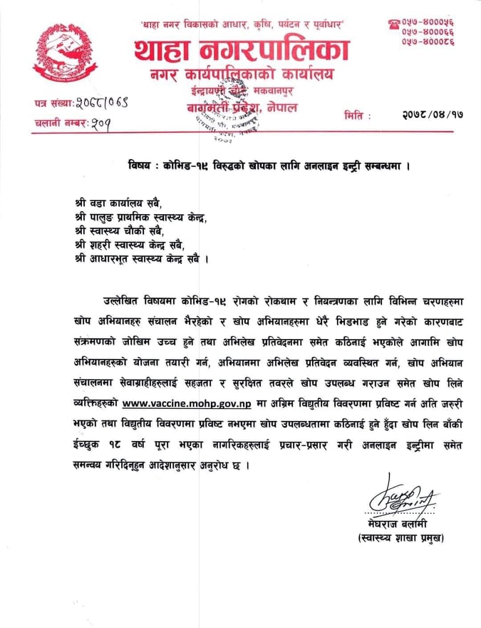 खोप अभियान सञ्चालनमा सेवाग्राहीहरुलाई सहजता र सुरक्षित तवरले खोप उपलब्ध गराउन समेत खोप लिने व्यक्तीहरुको अग्रिम विधुतीय विवरणमा प्रविष्ट गर्न अति जरुरी भएको  थाहा नगरपालिका स्वास्थ्य शाखा प्रमुख मेघराज बलामीले बताउनु भयो । विधुतीय विवरणमा प्रविष्टि नभएमा खोप उपलब्ध गर्न कठिनाई हुने हुदा खोप लिन बाँकीहरुले अनलाइन इन्ट्रीबाट फारम भर्नु पर्ने शाखा प्रमुख बलामीले बताउनु भयो । अनलाइन इन्ट्री www.vaccine.mohp.gov.np  मा लग अन गरि आवश्यक व्यक्तिगत विवरण प्रविष्टि गर्न सकिनेछ ।
