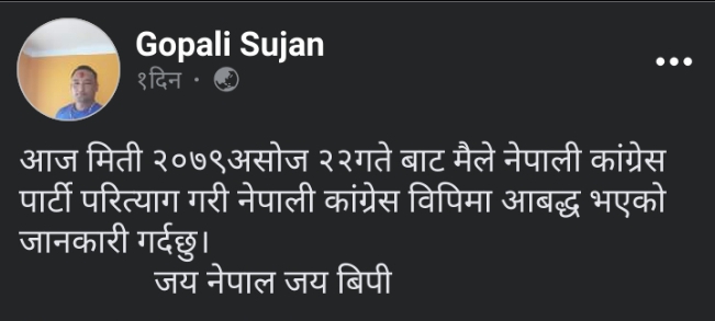 नेपाली काङ्ग्रेस मकवानपुर क्षेत्र न २ (क )का सभापति सुजन गोपालीले पार्टी परित्याग गरि ,काङ्ग्रेस बिपिमा आबद्ध भएको बताएका छन।