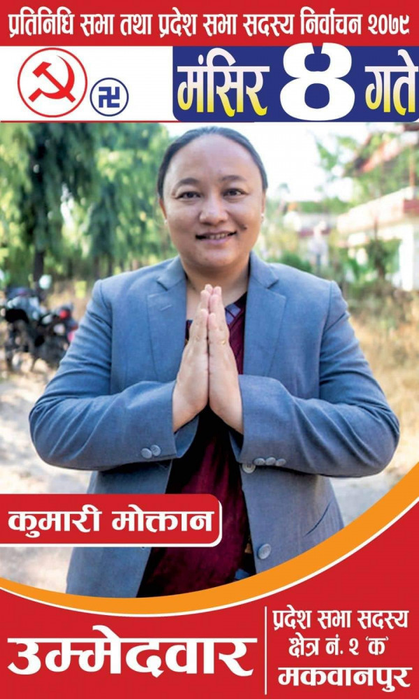 कात्तिक , मकवानपुर/ नेकपा (माओबादी केन्द्र)की पोलिटब्युरो सदस्य, मकवानपुर ईञ्चार्ज, बागमति प्रदेश सामाजिक बिकास मन्त्री तथा प्रदेश सभा मकवानपुर २ (क) उम्मेद्वार कुमारी मोक्तानले जनताकाे सेवामा आफु जुनसुकै परिस्थितिको सामना गर्न तयार भएको बताउनुभयो । उहाँले लगातार जनताकाे सेवामा गर्नु नै आफ्नो जीवनको लक्ष्य भएको समेत बताउनुभयो ।