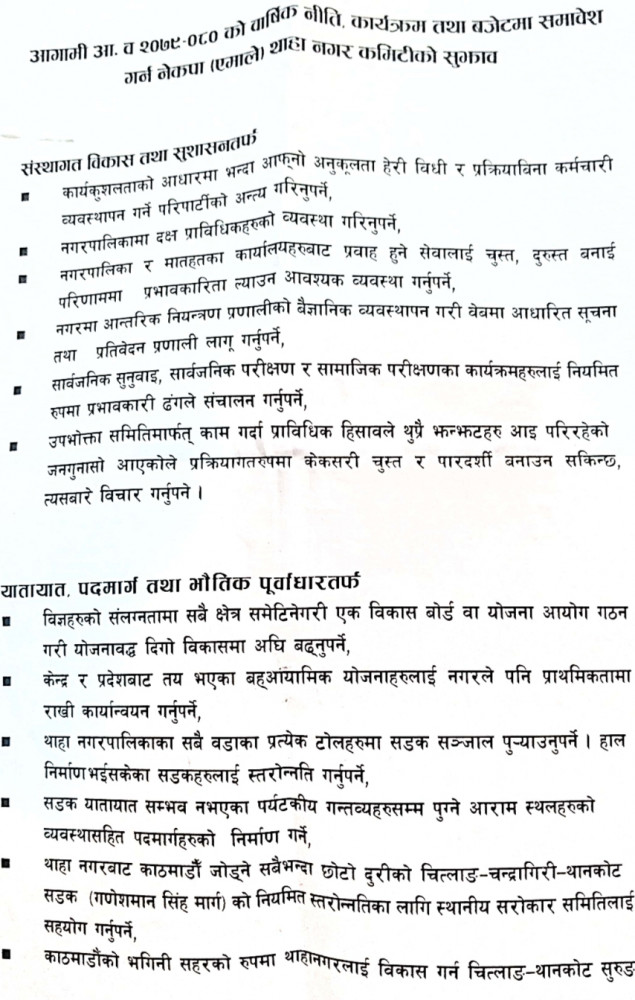 नेकपा एमाले थाहा नगर कमिटीले थाहा नगरपालिकाको आर्थिक बर्ष २०७९/०८० को नीति तथा कार्यक्रममा बिबिध विषयहरु समेट्न नगरपालिकालाई सुझाव दियको छ।