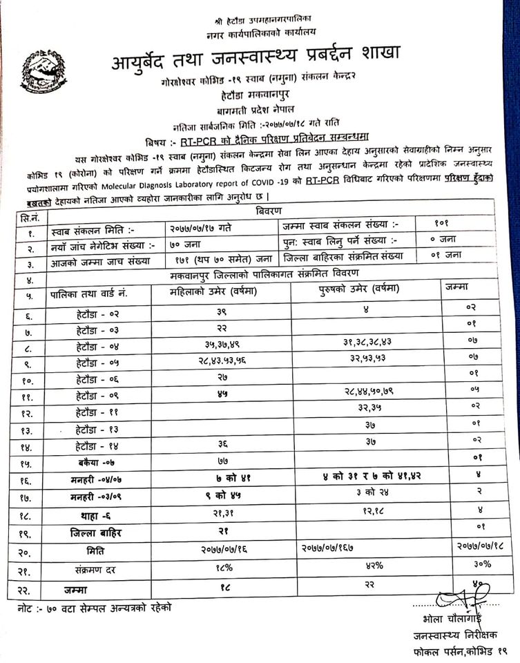 मंगलबार संक्रमण पुष्टि भएका सबैलाई होम आइसोलेसनमा राखिएको थाहा नगर स्वास्थ्य शाखाप्रमुख बलामीले जानकारी दिनुभयो ।